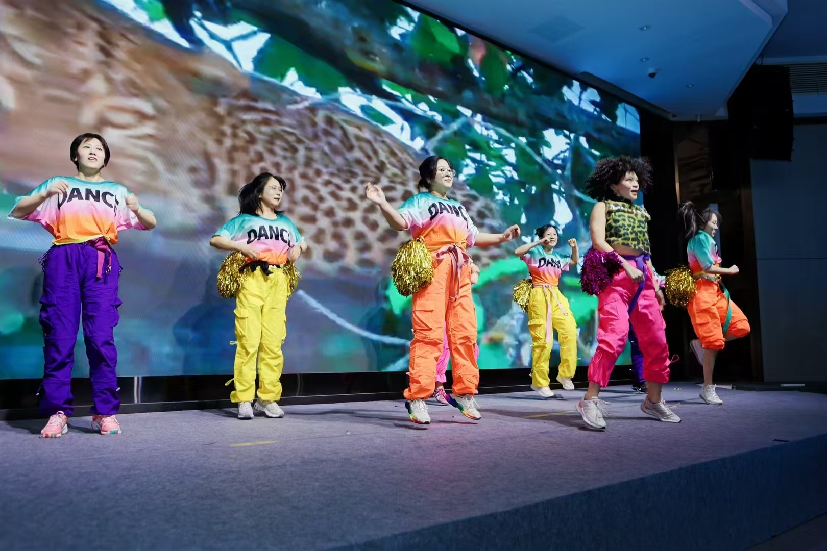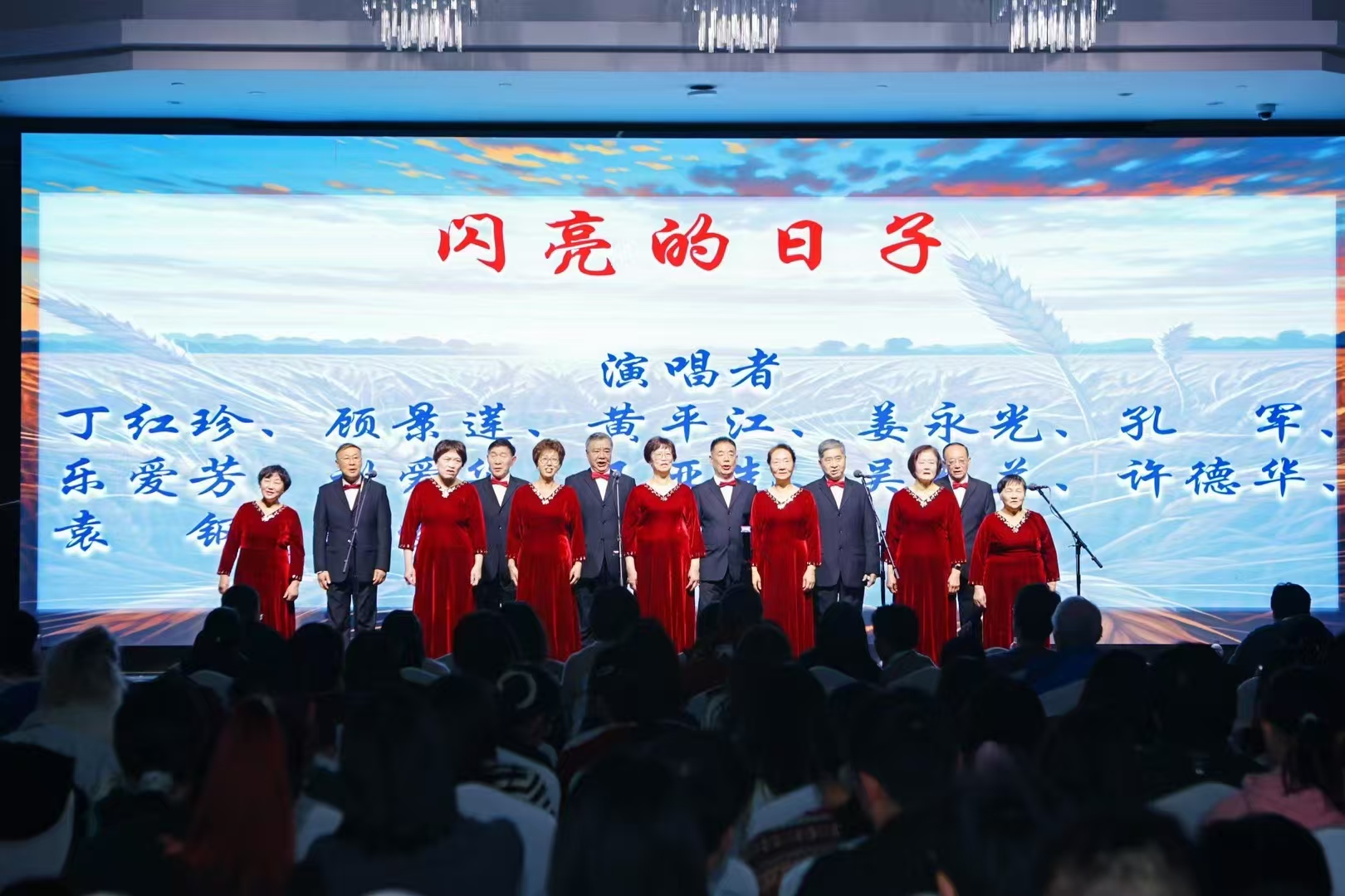 “閃亮的日子” 篇章洋溢著溫馨與歡樂(lè)?;@球操《本草綱目辣不辣》動(dòng)感十足,表演者們活力迸發(fā),點(diǎn)燃了現(xiàn)場(chǎng)的熱烈氣氛。退休職工代表帶來(lái)的小組唱《閃亮的日子》,歌聲悠揚(yáng)婉轉(zhuǎn),仿佛帶領(lǐng)大家回溯那些美好的舊時(shí)光。中心四位PI組成的 “老男孩組合” 驚喜現(xiàn)身,他們共同演唱《光輝歲月》《直到世界盡頭》。熟悉的旋律響起,激昂的歌聲中飽含著對(duì)往昔奮斗歲月的深情回顧,以及對(duì)未來(lái)的堅(jiān)定信念,引發(fā)了全場(chǎng)的強(qiáng)烈共鳴,將現(xiàn)場(chǎng)氣氛推向高潮。抽獎(jiǎng)環(huán)節(jié)穿插其中,驚喜連連,歡聲笑語(yǔ)回蕩在整個(gè)大廳,盡顯中心大家庭的溫暖與融洽。