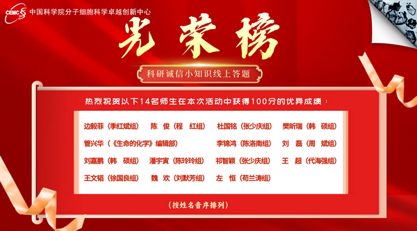 熱烈祝賀以下14名師生在本次活動中獲得100分的優(yōu)異成績(按姓名音序排列):邊毅菲(季紅斌組)、陳俊(程紅組)、杜國銘(張少慶組)、樊昕瑞(韓碩組)、管興華(《生命的化學(xué)》編輯部)、李錦鴻(陳洛南組)、劉磊(周斌組)、劉嘉鵬(韓碩組)、潘宇寅(陳玲玲組)、祁智穎(張少慶組)、王超(代海強組)、王文韜(徐國良組)、魏歡(劉默芳組)、左恒(茍?zhí)m濤組)。