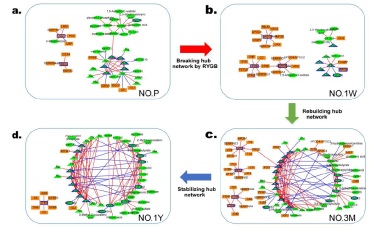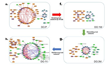 研究者進一步對這些個體的蛋白質(zhì)與代謝物相互作用的分子網(wǎng)絡(luò)中主要連接點(Hub)進行了深入的分析。結(jié)果表明,非糖尿病肥胖個體和肥胖糖尿病患者表現(xiàn)出的術(shù)后恢復(fù)路徑之差別,可以從其生物分子網(wǎng)絡(luò)的網(wǎng)絡(luò)結(jié)構(gòu)和重構(gòu)過程得到很好的解釋。代謝性手術(shù)可以使得機體的生理狀態(tài)發(fā)生系統(tǒng)重建,正是這樣整體性的重建,使得糖尿病和肥胖得以治愈。而非糖尿病肥胖個體和肥胖糖尿病患者網(wǎng)絡(luò)重建的途徑,速度和模式皆不相同。這一發(fā)現(xiàn)提供了治療代謝性疾病的若干潛在靶點,也表明代謝性疾病的治愈是基于網(wǎng)絡(luò)重構(gòu)的多靶點作用機制,而非控制單靶點就能達(dá)到理想的治療效果,這為代謝性疾病的治療提供了新的思路。