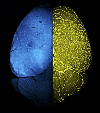 左側(cè):血腦屏障傳統(tǒng)遺傳靶向工具小鼠Mfsd2a-CreER; R26-tdTomato標(biāo)記大腦細(xì)胞熒光圖