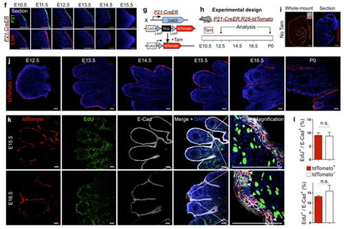 本研究中,研究人員首先通過P21和SAβ-Gal的染色確認(rèn)它們在四肢頂外胚層嵴處從E15.5天開始消失。為了揭示胚胎期衰老細(xì)胞的命運(yùn),研究人員在周斌研究員的指導(dǎo)下,利用胚胎時期細(xì)胞衰老的分子標(biāo)志P21,構(gòu)建了
