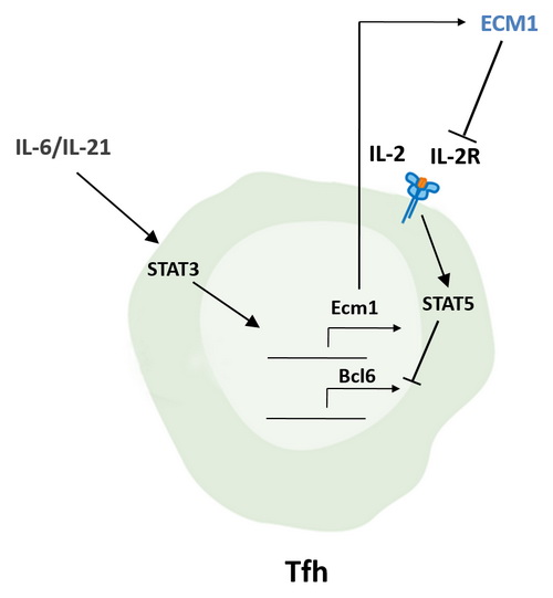 本研究發(fā)現(xiàn)ECM1缺失小鼠表現(xiàn)出TFH細胞分化、生發(fā)中心形成和抗原特異性抗體分泌的顯著降低;相反,給野生型小鼠體內(nèi)注入過量的重組ECM1蛋白會增強TFH細胞分化和生發(fā)中心反應;給流感感染小鼠注射重組ECM1蛋白會增強TFH細胞分化,促進流感特異性中和性抗體的分泌;進一步機制研究發(fā)現(xiàn)ECM1通過阻斷IL-2-STAT5信號通路來抑制Blimp1的表達,同時促進Bcl6的表達,從而調(diào)控TFH細胞的分化;此項成果揭示出ECM1蛋白可以正性調(diào)控TFH細胞的分化和抗體生成,有重要的科學意義和潛在的應用價值。