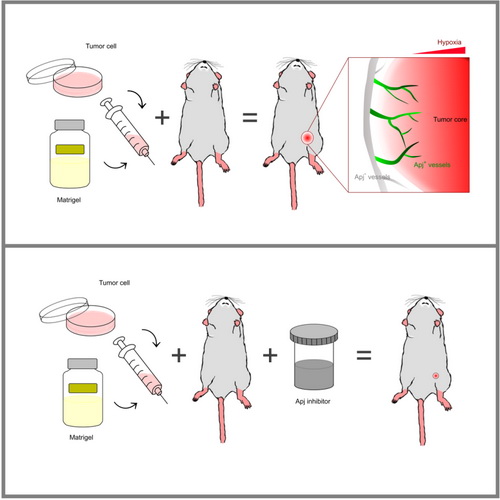 在本項研究中,研究人員構(gòu)建了特異性靶向新生血管受體的工具小鼠Apj-CreER和Apj-DTRGFP-Luc,然后在成體Apj-CreER;Rosa-GFP小鼠體內(nèi)構(gòu)建皮下腫瘤移植模型、原位腫瘤移植模型、基因缺陷原位腫瘤模型和化合物誘導(dǎo)腫瘤模型,并在特定時間點灌胃他莫昔芬,利用遺傳譜系示蹤技術(shù)追蹤Apj的表達情況,發(fā)現(xiàn)Apj可以特異性地標(biāo)記大部分的腫瘤新生血管而不標(biāo)記其他健康成體器官中的血管。接著研究人員利用一系列體外實驗和Apj-CreER;Rosa-GFP;Flk1 fl/fl小鼠發(fā)現(xiàn)Apj在腫瘤血管中上調(diào)主要受到缺氧因子的誘導(dǎo)和VEGF信號通路調(diào)控。然后研究人員在建立皮下腫瘤移植模型之后,利用三種方法(對Apj-CreER;Rosa-GFP/DTA小鼠灌胃他莫昔芬誘導(dǎo)“死亡基因”表達;Apj-DTRGFP-Luc小鼠注射DT; Apj受體抑制劑)特異性地抑制或清除Apj陽性的細胞,一定時間后收集腫瘤和各器官,發(fā)現(xiàn)可以顯著抑制血管新生和腫瘤增殖。該工作進一步揭示了腫瘤血管新生和惡性增殖的關(guān)系,為腫瘤疾病治療等提供了一個新的研究靶點。