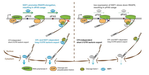 在正常狀態(tài)下,NXF1輔助RNA聚合酶II的轉(zhuǎn)錄延伸,促進遠(yuǎn)端PAS被優(yōu)先使用,產(chǎn)生長3’UTR異構(gòu)體;NXF1與CFI-68協(xié)同作用輔助長3’UTR異構(gòu)體的出核轉(zhuǎn)運。當(dāng)NXF1水平較低時,轉(zhuǎn)錄延伸變慢,導(dǎo)致近端PAS被優(yōu)先使用,產(chǎn)生短3’UTR的異構(gòu)體;短3’UTR異構(gòu)體的出核轉(zhuǎn)運對NXF1和CFI-68的表達(dá)水平相對不敏感。