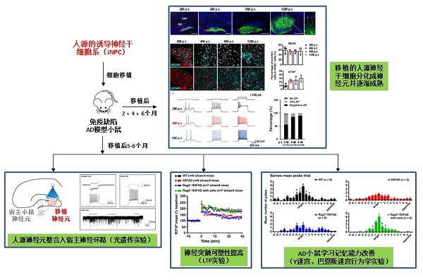 在此基礎上,景乃禾研究組及其合作團隊在本項研究中從成人外周血的單核細胞建立了非整合的、攜帶前腦位置信息的神經(jīng)前體細胞(induced neural progenitor cells,iNPCs)系。他們將得到的人源iNPCs移植到AD模型小鼠的海馬區(qū), 首次證實iNPCs分化出的外源神經(jīng)元和宿主神經(jīng)元之間存在突觸傳遞,可以功能性地整合到AD小鼠的海馬神經(jīng)環(huán)路中,修復AD小鼠受損的神經(jīng)網(wǎng)絡,并提高了AD小鼠的突觸可塑性,進而使得AD小鼠的學習和記憶功能顯著改善。該項研究深入揭示了人源神經(jīng)干細胞用于AD細胞替代治療的可行性和應用前景,為AD的治療提供了新的策略和方向。