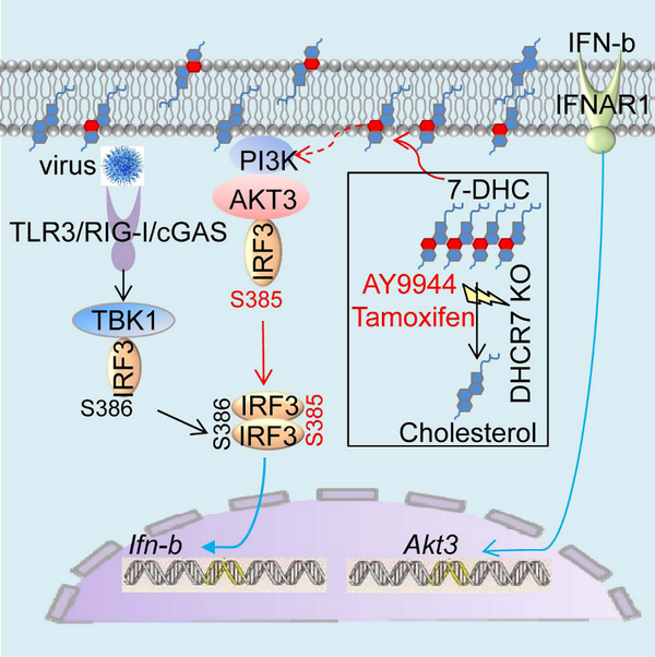 進(jìn)一步的機(jī)制探索發(fā)現(xiàn):靜息期的巨噬細(xì)胞表達(dá)很低水平的AKT3,病毒感染促進(jìn)AKT3的表達(dá),而代謝產(chǎn)物7-DHC能促進(jìn)PI3K-AKT3的活化。此外,作為蛋白激酶的AKT3直接結(jié)合IRF3,增強(qiáng)IRF3在絲氨酸385位的磷酸化,進(jìn)而促進(jìn)IRF3二聚體形成和向細(xì)胞核內(nèi)轉(zhuǎn)移,最終增強(qiáng)IFNβ產(chǎn)生。敲除AKT3的小鼠顯著降低IFNβ的產(chǎn)生,升高病毒載量,導(dǎo)致更多小鼠死亡。