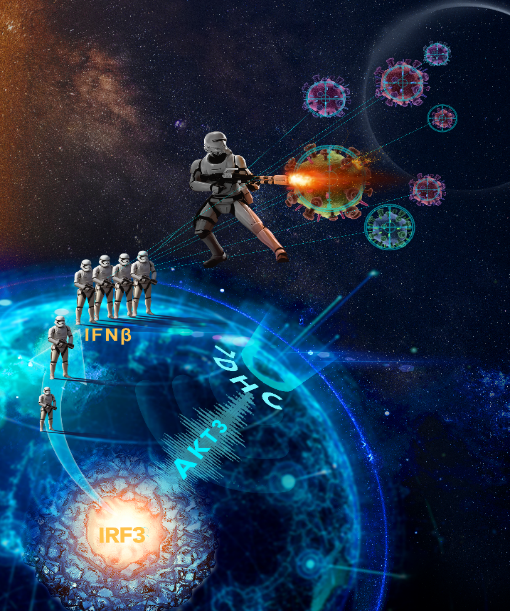 卡通科普?qǐng)D:當(dāng)外星體入侵地球時(shí),地球表層的預(yù)警中心(7-DHC)發(fā)射急救信號(hào)(AKT3)到達(dá)地心指揮部(IRF3),使得地球衛(wèi)士(IFNβ)大量并迅速集合,運(yùn)輸?shù)接钪嬷械挚雇庑求w