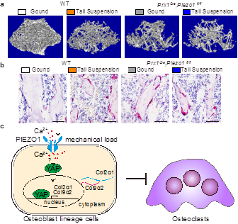 a. μ-CT 3D圖像顯示Piezo1缺失的小鼠出現(xiàn)骨質(zhì)疏松,尾懸掉處理在野生型小鼠中導(dǎo)致骨質(zhì)疏松,不能進(jìn)一步加劇Piezo1缺失的小鼠的骨質(zhì)疏松;b. 尾懸吊與Piezo1缺失導(dǎo)致破骨細(xì)胞染色增加;c. PIEZO1響應(yīng)機(jī)械應(yīng)力,通過調(diào)控YAP核定位調(diào)節(jié)Col2α1和Col9α2表達(dá),進(jìn)而影響破骨細(xì)胞。