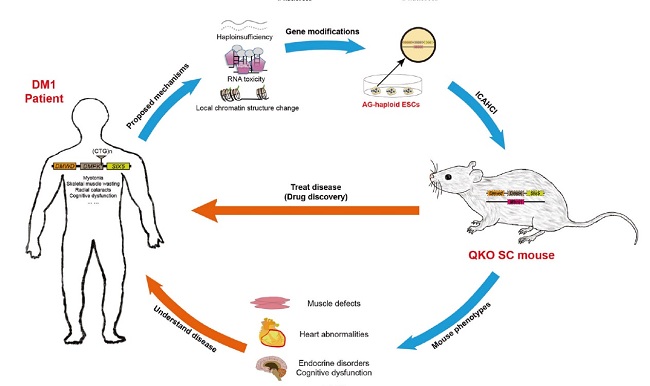 該研究通過利用“人造精子細(xì)胞”介導(dǎo)半克隆技術(shù)快速構(gòu)建多基因劑量下調(diào)小鼠模型模擬出DM1的多數(shù)病癥,提供了直接證據(jù)支持CTG重復(fù)序列的異常擴增導(dǎo)致多個基因表達(dá)水平變化(下調(diào))從而誘發(fā)DM1的復(fù)雜病理表型的假說;同時,這些模型的建立為深入研究DM1的發(fā)病機理和進(jìn)行藥物篩選奠定了基礎(chǔ)。