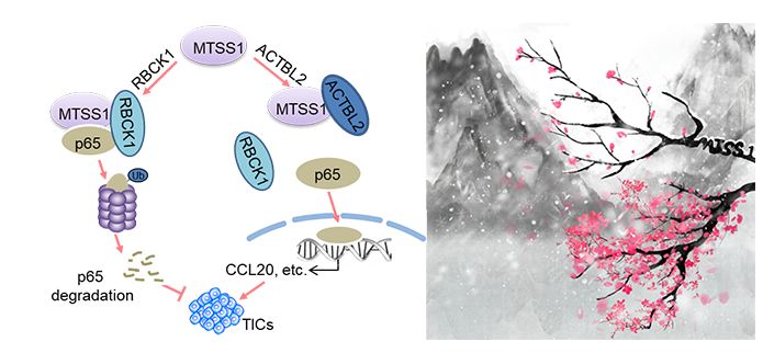 此項研究發(fā)現(xiàn),在管腔型和基底型乳腺癌小鼠腫瘤模型中,敲除Mtss1增強了正常乳腺上皮細胞向腫瘤起始細胞的轉(zhuǎn)化,并提高其致瘤性和轉(zhuǎn)移性。在乳腺癌病人來源的異體移植物和類器官中同樣證實了MTSS1抑制腫瘤起始的功能以及乳腺癌細胞的遷移與侵襲,表明MTSS1是乳腺癌發(fā)生發(fā)展的負調(diào)控因子。機制研究表明, MTSS1與E3泛素連接酶RBCK1相互作用,促進RBCK1介導的p65蛋白的泛素化及降解,從而抑制NF-κB信號通路和腫瘤形成。同時,在癌細胞內(nèi)存在另一蛋白ACTBL2,能通過與RBCK1競爭性地結(jié)合MTSS1,進而穩(wěn)定p65,激活NF-κB下游靶基因的轉(zhuǎn)錄,促進腫瘤發(fā)生。