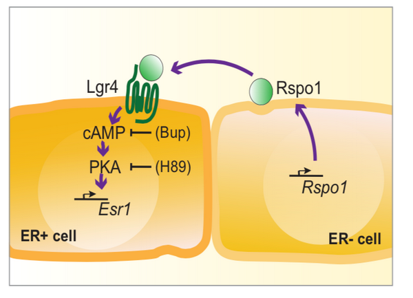 在本研究中,曾藝研究組發(fā)現(xiàn)了Rspo1與干細(xì)胞調(diào)控不相關(guān)的、以不依賴(lài)于Wnt/ β –catenin信號(hào)通路的一種新功能。Rspo1能上調(diào)雌激素受體(Esr1)的表達(dá),從而促進(jìn)乳腺中雌激素信號(hào)轉(zhuǎn)導(dǎo)通路的激活。機(jī)制研究發(fā)現(xiàn)Rspo1的這種作用依賴(lài)于表面受體Lgr4和細(xì)胞內(nèi)cAMP-PKA信號(hào)的傳導(dǎo),但不依賴(lài)于Wnt/β-Catenin信號(hào)通路。利用Rspo1 和 Wnt4的條件性敲除小鼠,從體內(nèi)實(shí)驗(yàn)證實(shí)了Rspo1對(duì)于Esr1表達(dá)以及雌激素信號(hào)通路激活的正調(diào)控,并且該調(diào)控不依賴(lài)于Wnt4的信號(hào)傳導(dǎo)。以往的研究普遍認(rèn)為Rspo1是一個(gè)Wnt信號(hào)通路的激動(dòng)劑,而該項(xiàng)工作發(fā)現(xiàn)了一個(gè)Rspo1獨(dú)立于Wnt/β-Catenin信號(hào)通路的新作用機(jī)制: Rspo1通過(guò)GPCR激活細(xì)胞內(nèi)cAMP-PKA信號(hào)傳導(dǎo)進(jìn)而調(diào)控Esr1的表達(dá)。該研究將拓寬我們對(duì)Wnt信號(hào)通路成員如何通過(guò)其他信號(hào)通路發(fā)揮作用的認(rèn)識(shí)。同時(shí),闡明Rspo1-Lgr4-cAMP-ERα的調(diào)控機(jī)制可以為雌激素相關(guān)的疾病的機(jī)制解析以及治療方案提供新的靶向思路。