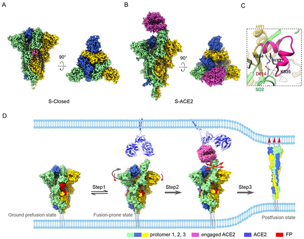 (A) 新冠病毒刺突蛋白三聚體緊密閉合構(gòu)象的2.7埃分辨率的冷凍電鏡結(jié)構(gòu)。(B)刺突蛋白結(jié)合受體ACE2形成復(fù)合體的3.8埃分辨率的冷凍電鏡結(jié)構(gòu)。ACE2紫紅色表示。(C)刺突蛋白SD2結(jié)構(gòu)域的D614與相鄰亞基的FP(深粉色)之間形成氫鍵作用網(wǎng)絡(luò)的放大圖。(D)ACE2誘導(dǎo)刺突蛋白三聚體從prefusion狀態(tài)向postfusion狀態(tài)的動(dòng)態(tài)轉(zhuǎn)變分子機(jī)制示意圖?!?/p>