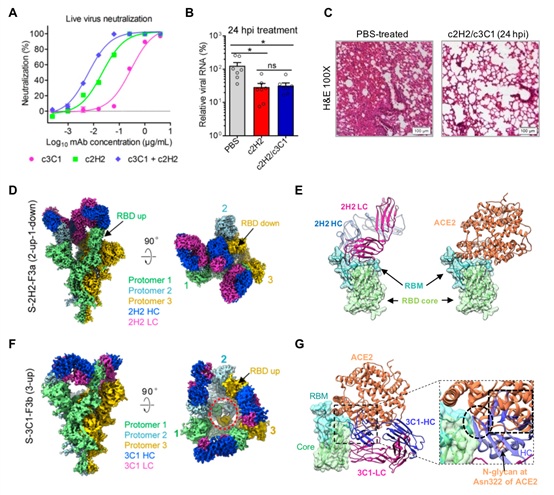 (A)人鼠嵌合化單抗c3C1、c2H2及其組合對(duì)SARS-CoV-2活毒的中和;(B-C)嵌合化單抗組合在Ad5-ACE2轉(zhuǎn)導(dǎo)的小鼠感染模型上的治療效果(B圖為感染小鼠肺部的病毒RNA的相對(duì)定量(RT-QPCR法);C圖為肺部的病理切片);(D-E)抗體2H2與新冠病毒S蛋白三聚體結(jié)合形成復(fù)合體的3.8埃分辨率的冷凍電鏡結(jié)構(gòu);2H2與受體結(jié)合域RBD的結(jié)合界面分析,2H2與該病毒受體ACE2在RDB上的占位有明顯空間沖突;(F-G)抗體3C1與新冠病毒S蛋白三聚體結(jié)合形成復(fù)合體的冷凍電鏡結(jié)構(gòu);3C1與RBD的結(jié)合界面分析,3C1的重鏈與新冠受體ACE2有空間沖突。
