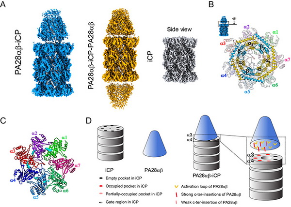 ?。ˋ)免疫蛋白酶體PA28αβ-iCP及iCP的冷凍電鏡結(jié)構(gòu),PA28αβ即可以結(jié)合在iCP的一端,也可以兩端同時(shí)結(jié)合;(B)PA28αβ與iCP的相對空間排布;(C)PA28αβ-iCP復(fù)合體中PA28αβ與iCP的相互作用界面,其中插入iCP環(huán)的PA28αβ的C末端尾巴由青色密度表示;(D)PA28αβ結(jié)合并激活iCP的分子機(jī)制示意圖。