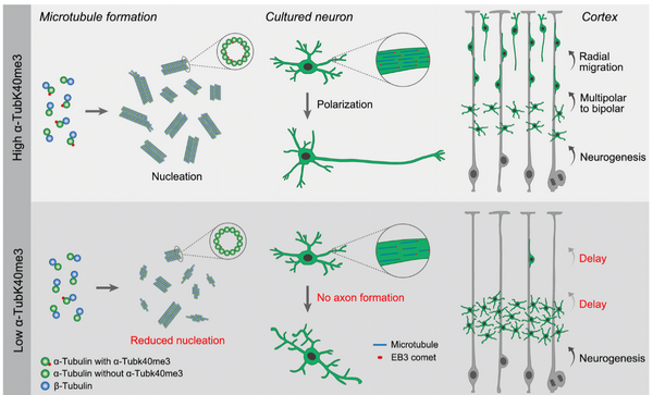 在大腦皮層的發(fā)育過程中,新生的神經(jīng)元需要遷移到達(dá)指定的位置進(jìn)行環(huán)路的連接,這一過程對(duì)于大腦皮層的形成非常重要。微管作為細(xì)胞內(nèi)一種主要的細(xì)胞骨架成分,在神經(jīng)元的遷移過程中發(fā)揮著重要的作用。微管的動(dòng)態(tài)性受多種微管蛋白翻譯后修飾的調(diào)控。研究組前期的研究工作發(fā)現(xiàn),α微管蛋白第40位賴氨酸上的乙酰化修飾在神經(jīng)系統(tǒng)發(fā)育過程中發(fā)揮重要的作用,α微管蛋白乙?;娜笔?huì)引起皮層神經(jīng)元遷移的缺陷,并導(dǎo)致神經(jīng)元出現(xiàn)過度生長(zhǎng)和分支的表型(Li et al, J Neurosci, 2012; Wei et al, Cereb Cortex, 2018)。已有研究表明,在α微管蛋白乙?;揎椀耐晃稽c(diǎn)上還存在著由SETD2催化的三甲基化修飾,但關(guān)于α微管蛋白三甲基化修飾對(duì)微管功能的調(diào)控機(jī)制及其在神經(jīng)系統(tǒng)發(fā)育過程中的作用還知之甚少。