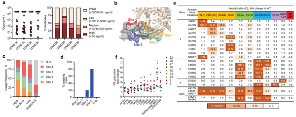 a.來自4個新冠康復(fù)患者的93個RBD特異性抗體的中和活性,b.利用單抗盤將抗原表位分為四大類, c.抗原表位與中和活性的構(gòu)效關(guān)系, d.抗原表位與交叉識別SARS-CoV及SARS-CoV-2能力的構(gòu)效關(guān)系, e.單克隆中和抗體對天然變異毒株的中和能力, f.新冠康復(fù)患者外周血清對天然變異毒株的中和能力。
