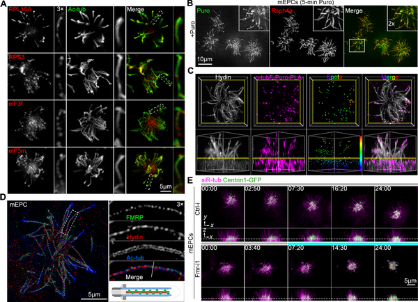 ?。ˋ)核糖體大小亞基蛋白(RPL和RPS)與翻譯起始因子eIF3復(fù)合物組分定位于原代培養(yǎng)的腦室管膜運動纖毛中;(B)嘌呤霉素(Puro)脈沖標記檢測到運動纖毛內(nèi)原位合成的新生多肽鏈;(C)利用鄰位連接分析技術(shù)檢測到纖毛內(nèi)原位翻譯的α微管蛋白;(D)FMRP以點狀沿纖毛中央腔分布;(E)時間序列圖像顯示FMRP缺失的纖毛發(fā)生退行性解聚的過程。