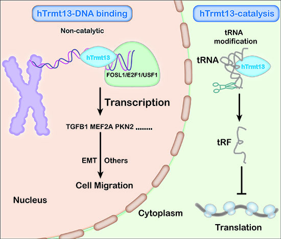 研究團(tuán)隊(duì)鑒定了人tRNA第四位2'-O-甲基轉(zhuǎn)移酶并將其命名為hTrmt13。 報(bào)道了hTrmt13進(jìn)行翻譯和轉(zhuǎn)錄調(diào)控的雙重機(jī)制。一方面,hTrmt13在細(xì)胞質(zhì)中催化多個(gè)tRNA的2'-O-甲基化,該修飾通過影響特定的tRNA片段(tRF)的生成進(jìn)而影響翻譯過程。另一方面,細(xì)胞核定位的hTrmt13直接結(jié)合DNA,作為關(guān)鍵上皮-間充質(zhì)轉(zhuǎn)化因子的轉(zhuǎn)錄共激活因子從而促進(jìn)乳腺癌細(xì)胞遷移,此過程不依賴于tRNA修飾活力。而且,hTrmt13的這一雙重功能相互排斥。進(jìn)一步分析發(fā)現(xiàn)hTrmt13的表達(dá)與肝癌、腎癌和乳腺癌病人的預(yù)后相關(guān)。該研究對(duì)tRNA修飾酶的非催化功能尤其是轉(zhuǎn)錄調(diào)控方面的功能理解提供了新視角。