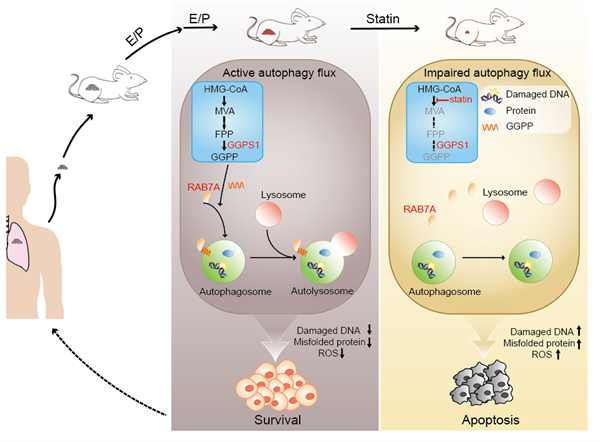 該研究通過(guò)建立小細(xì)胞肺癌患者樣本來(lái)源的異種移植瘤 (PDX)和人小細(xì)胞肺癌細(xì)胞系來(lái)源的移植瘤小鼠模型,模擬臨床給藥方案對(duì)這些小鼠模型進(jìn)行了長(zhǎng)達(dá)一年半的化療藥物處理,最終建成了多個(gè)小細(xì)胞肺癌化療耐藥的小鼠模型。在此基礎(chǔ)上,研究人員專門利用一個(gè)含有1971個(gè)美國(guó)FDA認(rèn)證的藥物庫(kù)來(lái)篩選能夠特異性抑制化療耐藥細(xì)胞存活的潛在藥物。有意思的是,他們發(fā)現(xiàn)抑制甲羥戊酸代謝途徑的他汀類藥物能夠顯著地抑制化療耐藥細(xì)胞的存活。利用另外一個(gè)含256個(gè)美國(guó)FDA認(rèn)證的代謝類藥物庫(kù)進(jìn)行篩選驗(yàn)證,他們同樣發(fā)現(xiàn)多種他汀類藥物可以特異性抑制化療耐藥細(xì)胞的存活。研究人員由此猜測(cè),化療耐藥的小細(xì)胞肺癌可能發(fā)生代謝重編程并依賴甲羥戊酸代謝途徑來(lái)維持細(xì)胞存活。進(jìn)一步的機(jī)制研究發(fā)現(xiàn),他汀類藥物主要是通過(guò)抑制甲羥戊酸代謝途徑中香葉基香葉基二磷酸的生成,阻滯小G蛋白R(shí)AB7A的香葉基香葉基化修飾過(guò)程,使后者無(wú)法上膜發(fā)揮正常功能,進(jìn)而抑制自噬體與溶酶體的融合,引發(fā)自噬流障礙,促使耐藥細(xì)胞中ROS過(guò)度累積而發(fā)生細(xì)胞凋亡。