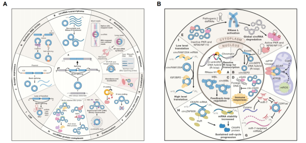 圖A:環(huán)形RNA的發(fā)現(xiàn)、鑒定和功能解析手段;圖B:環(huán)形RNA參與調(diào)控細胞內(nèi)多種生物學(xué)過程的分子模型;圖C:可翻譯的環(huán)形RNA及其調(diào)控模型;圖D:環(huán)形RNA在生物醫(yī)學(xué)領(lǐng)域的轉(zhuǎn)化應(yīng)用場景