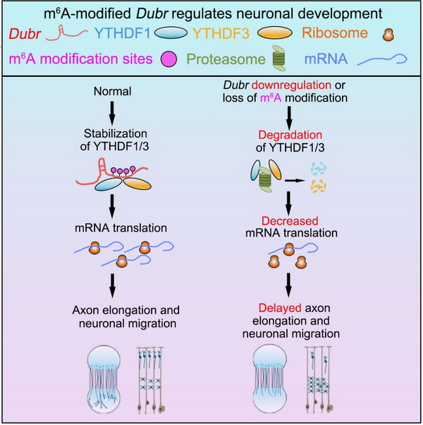 11月22日,國際學(xué)術(shù)期刊 Cell Reports 在線發(fā)表了中國科學(xué)院分子細(xì)胞科學(xué)卓越創(chuàng)新中心(生物化學(xué)與細(xì)胞生物學(xué)研究所)鮑嵐研究組的最新研究進(jìn)展“ m6A-modified lincRNA Dubr is required for neuronal development by stabilizing YTHDF1/3 and facilitating mRNA translation”。該研究揭示了長鏈非編碼RNA (lncRNA) Dubr的m6A修飾通過穩(wěn)定YTHDF1/3復(fù)合體以及其介導(dǎo)的mRNA翻譯從而調(diào)控軸突生長和神經(jīng)元遷移的分子機(jī)制。