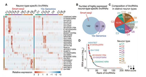本研究首先通過整合分析Smart-seq2和10x Genomics的初級(jí)感覺神經(jīng)元單細(xì)胞測(cè)序數(shù)據(jù),構(gòu)建了單個(gè)神經(jīng)元lincRNA的表達(dá)譜。通過計(jì)算特異性指數(shù)(Specificity measure, SPM)方法篩選并發(fā)現(xiàn)了200個(gè)細(xì)胞類型特異且高表達(dá)的lincRNA,并進(jìn)一步通過單細(xì)胞PCR、原位雜交和流式分選等方法對(duì)不同細(xì)胞類型lincRNA進(jìn)行了驗(yàn)證。同時(shí),還發(fā)現(xiàn)細(xì)胞類型特異的lincRNA與其基因組上臨近基因存在高度相關(guān)性,由于細(xì)胞核中定位的lincRNA能夠參與調(diào)控臨近基因的表達(dá),提示細(xì)胞類型特異的lincRNA可能具有順式調(diào)控作用。