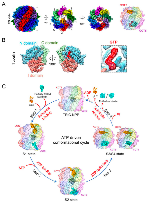 ?。ˋ)關(guān)環(huán)的TRiC-plp2-tubulin復(fù)合體的冷凍電鏡結(jié)構(gòu);(B)該結(jié)構(gòu)中TRiC內(nèi)部結(jié)合的tubulin及其加載的GTP的結(jié)構(gòu)細(xì)節(jié);(C)TRiC-plp2協(xié)同在TRiC的ATP酶構(gòu)象循環(huán)過程中協(xié)助主要細(xì)胞骨架蛋白tubulin/actin折疊的過程示意圖。