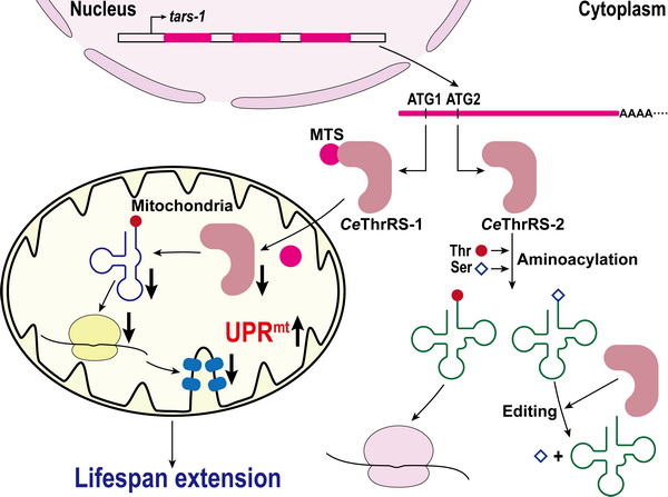 本研究中,研究人員首先分析了線蟲(C. elegans) ThrRS的基因與蛋白質(zhì)形式,發(fā)現(xiàn)線蟲只有一個(gè)潛在的ThrRS基因tars-1, 但卻注釋兩種不同長度的ThrRS;通過RT-PCR以及5’-RACE方法證明在線蟲體內(nèi),只有一種tars-1 mRNA,可能利用翻譯重起始產(chǎn)生兩種形式的ThrRS; 利用在哺乳動(dòng)物細(xì)胞中的熒光定位實(shí)驗(yàn),明確長形式ThrRS (CeThrRS-1)與短形式ThrRS (CeThrRS-2)分別定位于線粒體與細(xì)胞質(zhì)中;通過構(gòu)建兩種酵母遺傳學(xué)突變株,證明體內(nèi)tars-1通過翻譯重起始產(chǎn)生CeThrRS-1 以及CeThrRS-2,它們分別在線粒體與細(xì)胞質(zhì)蛋白質(zhì)合成中發(fā)揮作用;以CeThrRS-2為研究對(duì)象,系統(tǒng)研究了其介導(dǎo)的細(xì)胞質(zhì)與線粒體tRNA氨基酰化反應(yīng)的機(jī)制,并闡明了其催化的蛋白質(zhì)合成質(zhì)量控制機(jī)制。為了研究線粒體tars-1的生理功能,通過CRISPR–Cas9構(gòu)建線粒體tars-1敲低的線蟲品系,發(fā)現(xiàn)線粒體 tars-1 敲低線蟲出現(xiàn)發(fā)育遲緩、運(yùn)動(dòng)能力下降、產(chǎn)卵下降、壽命延長的表型,進(jìn)一步研究發(fā)現(xiàn)線粒體功能受損:耗氧率降低、復(fù)合物Ⅰ活性下降、線粒體出現(xiàn)還原應(yīng)激,UPRmt被激活,而線蟲壽命的延長依賴于UPRmt的激活。進(jìn)一步敲低線蟲及哺乳動(dòng)物細(xì)胞中多種線粒體aaRS,發(fā)現(xiàn)都能激活UPRmt,說明線粒體aaRS缺陷相關(guān)線粒體翻譯功能受損激活UPRmt具有普遍性及物種間的保守性。