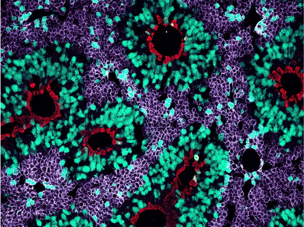 紅色:GS+肝細(xì)胞;紫色:E-Cad+肝細(xì)胞;綠色:GFP+肝細(xì)胞