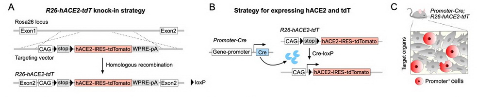 (A)R26-hACE2-tdT構建策略。(B,C)結合細胞特異性Cre工具,可實現(xiàn)在靶細胞中特異性表達hACE2并被永久性遺傳標記。