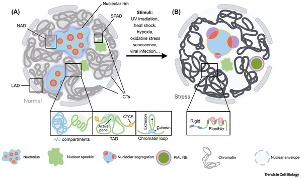 核內小體(NBs)是一種生物分子凝聚體,參與各種細胞過程并對細胞核中的細胞刺激做出反應。這些富含蛋白質和RNA的無膜結構,如核仁和核斑等,通過其組裝和發(fā)揮的功能,對細胞核的空間組織起到關鍵作用,調節(jié)局部和全局的染色質活動。近期各種新技術的發(fā)展,包括多種空間組學技術,揭示了核仁在調節(jié)核糖體DNA(rDNA)和相鄰非rDNA染色質活性方面的新作用,核斑在調控活躍基因組結構方面的作用,以及PML小體在應激條件下維持基因組穩(wěn)定性方面的作用。該綜述論文系統(tǒng)地總結了這些重要核內小體在基因組空間組織中的新功能,以及最近開發(fā)的多種空間組學方法在相關研究中的重要作用。