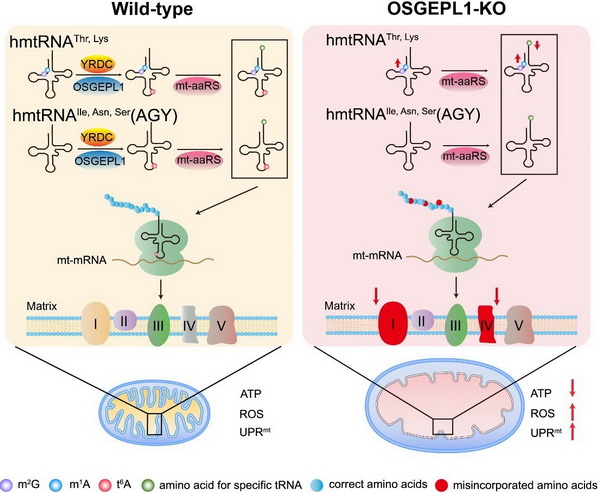 該研究首次發(fā)現(xiàn)線粒體tRNA t6A37修飾與m1A9,m2G10修飾的協(xié)同調(diào)控;系統(tǒng)揭示t6A37修飾對線粒體tRNA氨基?;降挠绊懀魂U明線粒體tRNA t6A37修飾缺失影響線粒體密碼子解碼保真性失調(diào)的機制。以上結(jié)果加深了人們對線粒體tRNA修飾的生物學(xué)功能的認識。