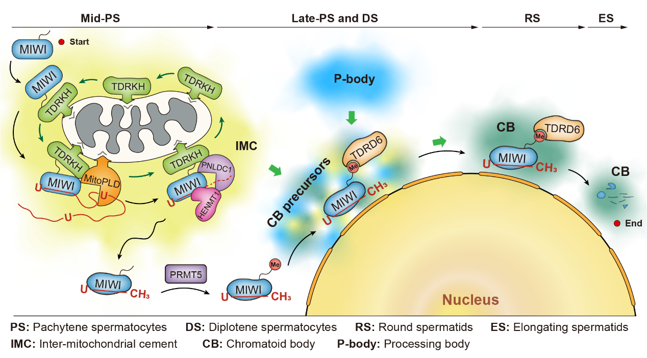 綜上,此項(xiàng)研究揭示了piRNA結(jié)合MIWI是如何啟動(dòng)并推動(dòng)MIWI從IMC轉(zhuǎn)移到CB的精細(xì)過程,建立piRNA加工生成和功能發(fā)揮之間的聯(lián)系,并證明了該機(jī)制為精子發(fā)生和雄性生殖必需,為相關(guān)男性不育癥的臨床診治提供了理論依據(jù)和潛在的靶點(diǎn)。