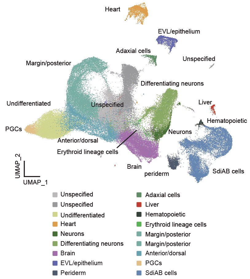 目前已有的斑馬魚(yú)細(xì)胞系均為多胚胎來(lái)源,缺乏同質(zhì)性,且因長(zhǎng)期傳代無(wú)法維持基因組穩(wěn)定性,導(dǎo)致細(xì)胞中有大量的染色體出現(xiàn)非整倍體化。該研究通過(guò)在細(xì)胞培養(yǎng)基中加入骨形態(tài)發(fā)生蛋白4 (Bone Morphogenetic Protein 4, BMP4),使得單胚胎來(lái)源的細(xì)胞系SdiAB (Single diploid blastomere from AB strain)能夠長(zhǎng)期保持基因組的穩(wěn)定。將SdiAB細(xì)胞的單細(xì)胞轉(zhuǎn)錄本數(shù)據(jù)與斑馬魚(yú)胚胎不同發(fā)育階段(從受精開(kāi)始到5 dpf)的單細(xì)胞轉(zhuǎn)錄本數(shù)據(jù)進(jìn)行深入比較,發(fā)現(xiàn)SdiAB細(xì)胞與胚胎上皮樣細(xì)胞的表達(dá)模式相似,例如都高表達(dá)角蛋白家族基因keratin 8。差異基因富集分析顯示該細(xì)胞系中整體生命活動(dòng)加快,具體表現(xiàn)為核糖體代謝相關(guān)基因上調(diào)、線(xiàn)粒體相關(guān)基因、氧化磷酸化循環(huán)相關(guān)通路、蛋白酶體信號(hào)通路上調(diào)等。