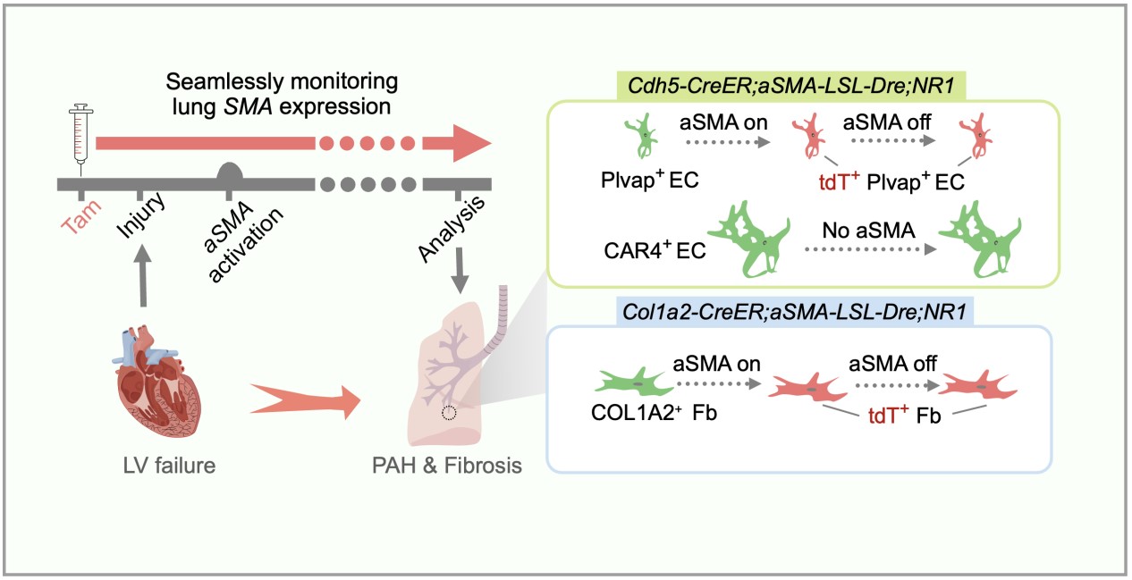 12月3日,國際學(xué)術(shù)期刊Cell Discovery在線發(fā)表了中國科學(xué)院分子細(xì)胞科學(xué)卓越創(chuàng)新中心(生物化學(xué)與細(xì)胞生物學(xué)研究所)周斌研究組與上海新華醫(yī)院孫錕研究組合作研究成果“Genetic Recording of Transient Endothelial Activation in Distinct Alveolar Capillary Cells during Pulmonary Fibrosis”。該工作利用雙同源重組酶的遺傳策略,記錄到在肺動(dòng)脈高壓疾病中血管內(nèi)皮細(xì)胞會(huì)瞬時(shí)激活間充質(zhì)基因aSMA(alpha-smooth muscle actin), 且該現(xiàn)象特異性地出現(xiàn)在肺泡特定的Plvap+的血管內(nèi)皮細(xì)胞中,并結(jié)合RNA-seq闡釋了該類血管內(nèi)皮細(xì)胞發(fā)生瞬時(shí)激活的意義。該工作為了解肺動(dòng)脈高壓和肺纖維化中的細(xì)胞命運(yùn)及其響應(yīng)提供了研究基礎(chǔ)。