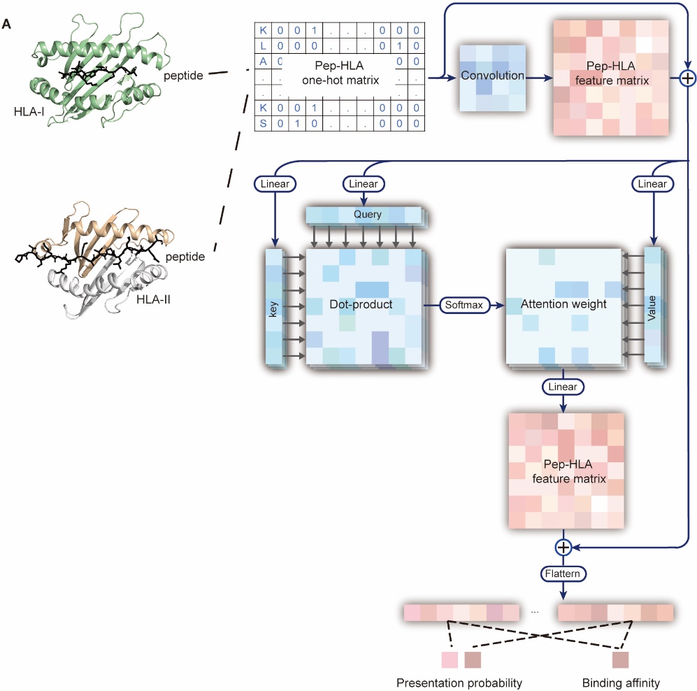 該研究中,研究人員開發(fā)了新的深度學(xué)習(xí)模型CapHLA。CapHLA由四個模塊組成:編碼層將多肽和HLA結(jié)合位點(diǎn)轉(zhuǎn)換為one-hot數(shù)字矩陣;卷積層捕捉蛋白酶水解特征和抗原處理相關(guān)轉(zhuǎn)運(yùn)蛋白轉(zhuǎn)運(yùn)多肽過程中的motif信息;attention層捕捉不同HLA基因型與多肽結(jié)合的特異氨基酸互作信息;特征選擇層綜合處理上述步驟得到的特征并獲得分析結(jié)果。CapHLA算法可以同時預(yù)測各種長度多肽以及HLA-I和HLA-II各種基因型的親和性及呈遞可能性。