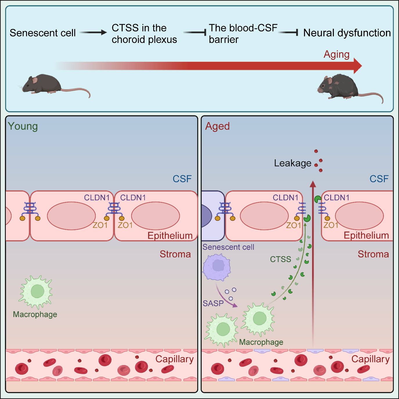衰老過程中脈絡(luò)叢中巨噬細(xì)胞分泌的CTSS破壞血-腦脊液屏障影響大腦功能的示意圖