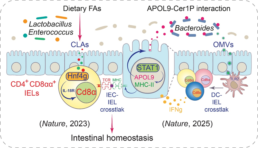 為此,研究團隊通過比較正常小鼠與無菌小鼠腸道粘液層蛋白質譜,并結合正常小鼠中結合腸道共生微生物的宿主蛋白質譜進行聯(lián)合分析,發(fā)現一類此前未受關注的新型微生物結合蛋白APOL9a/b。后續(xù)研究揭示APOL9a/b分子由小鼠腸上皮吸收細胞 (enterocyte) 分泌,且其表達受到微生物依賴的干擾素信號通路調控。利用人體腸道單細胞測序與蛋白序列進化分析,研究團隊同時發(fā)現人源APOL1-4分子與APOL9a/b同源,且APOL2在人腸上皮吸收細胞中表達最高。隨后,通過將微生物流式分選與16S rRNA測序相結合,研究團隊開發(fā)了APOL9a-seq技術,并發(fā)現APOL9a主要與小鼠腸道擬桿菌目細菌特異性結合。同時,研究團隊通過流式技術也發(fā)現鼠源APOL9a/b與人源APOL2分子對于人腸道擬桿菌菌株顯示同樣的選擇性結合能力。這種高度特異性的互作方式提示其在宿主-微生物共進化過程中具有重要意義。后續(xù)機制研究揭示在生理條件下這些APOL家族分子并不具有明顯的抗菌肽活性,但可通過與擬桿菌Cer1P分子結合以誘導其菌膜壓力從而促使大量外膜囊泡 (outer membrane vesicles, OMVs) 的分泌。共生菌來源的OMVs具有先天免疫原性,可通過誘導腸道IFNg的產生來促進腸上皮細胞MHC-II分子的表達,并最終介導了一類特殊CD4+CD8αα+腸上皮間T淋巴細胞(intraepithelial lymphocyte, IEL)的分化發(fā)育。而APOL9-Cer1P特異性互作介導的OMVs-IFNg-MHC-II-IEL軸對于宿主的抗感染免疫至關重要。
