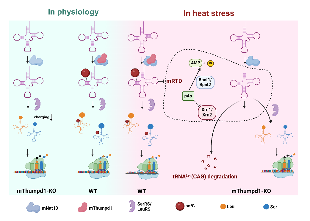 在本項研究中,研究人員首先明確Nat10與Thumpd1在細胞內(nèi)直接相互作用,并基于AlphaFold預(yù)測的蛋白質(zhì)結(jié)構(gòu)信息,鑒定了Nat10與Thumpd1相互作用的結(jié)構(gòu)域;純化了Thumpd1蛋白質(zhì),證明Thumpd1可以直接結(jié)合底物tRNA;通過CRISPR-Cas9基因編輯系統(tǒng),構(gòu)建了Thumpd1基因缺失的NIH/3T3細胞系;Thumpd1的敲除會導(dǎo)致底物tRNA上的ac4C12修飾喪失,證明Thumpd1是tRNA ac4C12形成必不可少的關(guān)鍵輔助因子;在生理條件下,ac4C12的缺失顯著下調(diào)tRNALeu和tRNASer的氨基?;剑撊毕菘梢酝ㄟ^過表達相應(yīng)的亮氨酰-tRNA合成酶和絲氨酰-tRNA合成酶加以拯救;通過翻譯組、RNA-seq等技術(shù)方法,揭示ac4C12的缺失顯著影響全局性翻譯效率,尤其是顯著抑制富含2個U/A 核苷酸的 Ser/Leu 密碼子的解碼效率;在熱刺激條件下,ac4C12的缺失特異性地導(dǎo)致tRNALeu(CAG)被快速降解;遺傳學(xué)實驗證明,tRNALeu(CAG)的降解是由5’-3’核酸外切酶Xrn1和Xrn2共同介導(dǎo);進一步研究表明, Bpnt1及Bpnt2通過調(diào)控體內(nèi)代謝物3’,5’-二磷酸腺苷(pAp)的水平,進而調(diào)節(jié)Xrn1和Xrn2核酸外切酶活性,直接調(diào)控tRNALeu(CAG)的快速水解。研究人員將這條受到精細調(diào)控的tRNA降解機制命名為mammalian RTD (mRTD)。