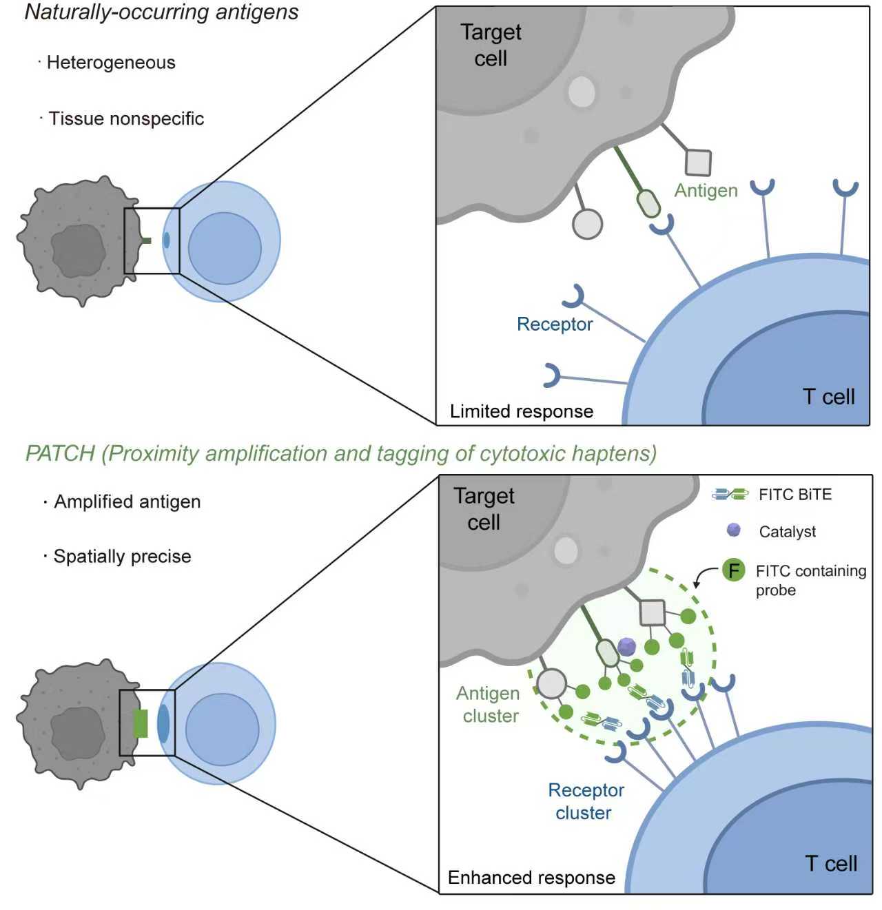 在該研究中,研究人員首次將鄰近標(biāo)記技術(shù)應(yīng)用于免疫功能調(diào)控,開(kāi)發(fā)了一種全新的細(xì)胞表面蛋白工程化策略(Proximity Amplification and Tagging of Cytotoxic Haptens, PATCH)。該策略的核心是一種可通過(guò)紅光或超聲響應(yīng)激活的工程化納米酶(PCN)。研究人員首先將這種納米酶靶向遞送至腫瘤細(xì)胞表面,隨后通過(guò)外部的紅光或超聲進(jìn)行精準(zhǔn)、無(wú)創(chuàng)的局部激活。被激活的納米酶會(huì)催化含有人工抗原(FITC)的探針?lè)肿?,使其與納米酶周?chē)鷶?shù)納米范圍內(nèi)的細(xì)胞表面蛋白發(fā)生快速、大量的共價(jià)連接。這一過(guò)程如同在靶細(xì)胞表面“種下”了高密度的人工抗原簇。