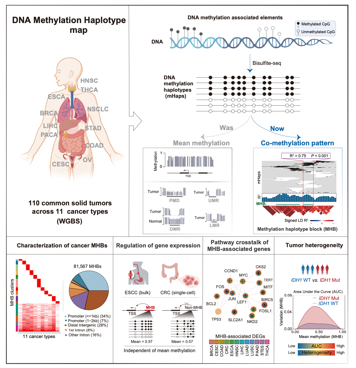 8月23日,國際學術(shù)期刊Cell Reports在線發(fā)表了中國科學院分子細胞科學卓越創(chuàng)新中心(生物化學與細胞生物學研究所)石建濤研究員與上海交通大學醫(yī)學院附屬瑞金醫(yī)院方海教授的最新研究成果“Toward the DNA methylation haplotype map of 11 common solid cancers”。該研究通過全基因組亞硫酸鹽測序(WGBS),繪制了11種中國人群常見實體瘤的DNA甲基化單體圖譜(DNA methylation haplotype map),并鑒定出81,567個DNA甲基化單體水平上的共甲基化區(qū)間,稱為DNA甲基化單體塊(Methylation Haplotype Blocks, MHBs)。大規(guī)模數(shù)據(jù)整合分析表明,腫瘤MHB富集了腫瘤特異性調(diào)控元件,和腫瘤細胞的基因表達調(diào)控顯著相關(guān),也能作為腫瘤液體活檢的標志物。