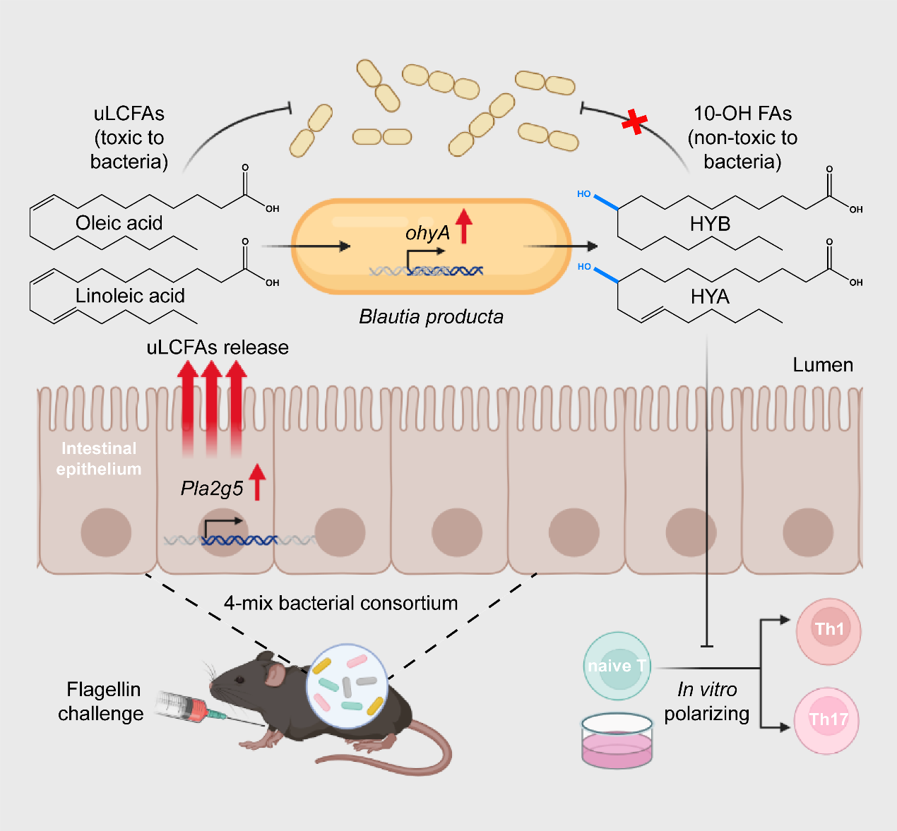 研究發(fā)現(xiàn),在細(xì)菌鞭毛蛋白誘導(dǎo)的宿主免疫激活模型中,"4-mix"菌群定植的小鼠腸道上皮細(xì)胞中磷脂酶編碼基因 Pla2g5顯著上調(diào)。PLA2G5 可特異性水解釋放細(xì)胞膜磷脂中的油酸(oleic acid, OA)、亞油酸(linoleic acid, LA)等 Δ9-uLCFAs,促進(jìn)其在腸腔中的積累。實(shí)驗(yàn)證據(jù)表明,過(guò)量的Δ9-uLCFAs 對(duì)共生菌具有一定毒性,而 Blautia producta 可通過(guò)上調(diào)油酸水合酶OhyA的表達(dá),將 OA、LA 分別轉(zhuǎn)化為對(duì)共生菌無(wú)毒性的 10-羥基脂肪酸(HYB、HYA)。除此以外,HYB 與 HYA 還具備免疫調(diào)節(jié)活性。體外 T 細(xì)胞分化實(shí)驗(yàn)顯示,HYA 和HYB均可抑制 Th17 細(xì)胞中IL-17的產(chǎn)生,而HYB 還可抑制 Th1 細(xì)胞 中IFN-γ的產(chǎn)生,提示這些脂肪酸代謝物可作為微生物來(lái)源的“免疫剎車分子”,通過(guò)抑制炎癥因子的表達(dá),避免宿主過(guò)度免疫反應(yīng)造成的損傷。此外,研究者發(fā)現(xiàn)給小鼠灌胃OA和LA同樣可誘導(dǎo)共生菌中ohyA基因的表達(dá)以及HYB、HYA在腸道中的積累,提示膳食uLCFAs亦對(duì)共生菌表達(dá)譜有直接影響。