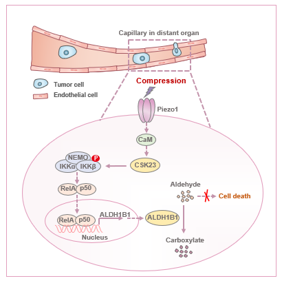 該研究運用靶向1685種代謝酶的CRISPR/Cas9體內(nèi)篩選體系,發(fā)現(xiàn)醛脫氫酶ALDH1B1是腫瘤細(xì)胞在肺毛細(xì)血管內(nèi)存活的關(guān)鍵因子。機(jī)制解析表明,機(jī)械擠壓促使CSK23與IKKβ激酶相互作用增強(qiáng),進(jìn)而誘導(dǎo)IKKβ第177和181位絲氨酸磷酸化,激活NF-κB信號通路,最終上調(diào)ALDH1B1的表達(dá)。ALDH1B1的上調(diào)增強(qiáng)了腫瘤細(xì)胞對醛類物質(zhì)的解毒能力,并通過抑制鐵死亡,幫助腫瘤細(xì)胞在受限的血管遷移環(huán)境中存活,從而促進(jìn)肺癌轉(zhuǎn)移。綜上所述,該研究揭示了機(jī)械力通過重塑醛類代謝調(diào)控細(xì)胞死亡的新機(jī)制,并闡明了該機(jī)制在腫瘤轉(zhuǎn)移中的重要功能。這一發(fā)現(xiàn)不僅深化了對腫瘤細(xì)胞在受限微環(huán)境中生存機(jī)制的認(rèn)識,也為開發(fā)靶向CSK23或ALDH1B1的抗腫瘤轉(zhuǎn)移策略提供了新方向。