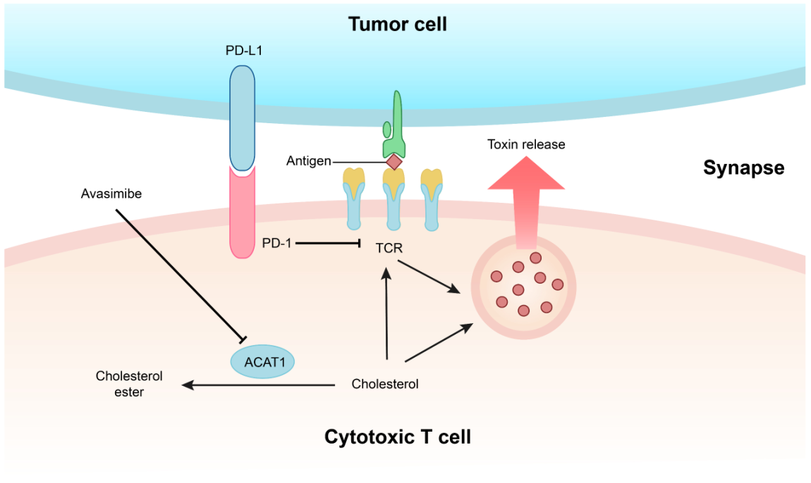 圖3. 基于膽固醇代謝調(diào)控的腫瘤免疫治療新方法。膽固醇酯化酶ACAT1可以將細(xì)胞內(nèi)的游離膽固醇轉(zhuǎn)化為膽固醇酯。抑制CD8+ T細(xì)胞的ACAT1活性可以使細(xì)胞質(zhì)膜的游離膽固醇水平上升,從而使得TCR信號(hào)增強(qiáng)并讓殺傷性免疫突觸更成熟。T細(xì)胞腫瘤抗原免疫應(yīng)答由此變得更加高效。