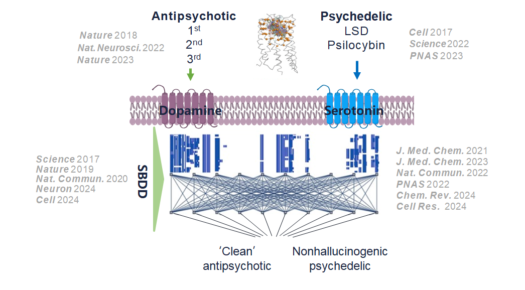 本研究組主要針對(duì)精神分裂癥、抑郁及焦慮癥、癡呆癥等神經(jīng)和精神疾病,開展神經(jīng)精神藥物與其靶點(diǎn)的結(jié)構(gòu)藥理研究,以此為基礎(chǔ)展開“更有效”“更安全”的新一代藥物設(shè)計(jì),為神經(jīng)系統(tǒng)疾病提供創(chuàng)新治療和干預(yù)方案。