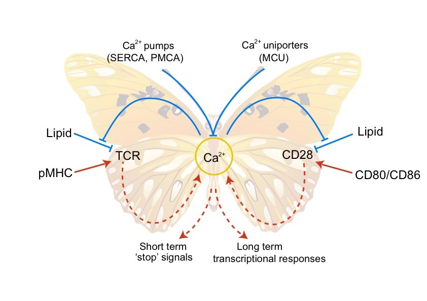T細胞的活化主要依賴于抗原受體TCR(T-cell receptor)和共刺激受體CD28。我們的前期研究表明TCR的活性受酸性磷脂調(diào)控。帶負電的酸性磷脂可以和帶正電的TCR胞內(nèi)區(qū)動態(tài)結(jié)合,從而將TCR的磷酸化位點屏蔽在膜內(nèi),保證TCR在靜息態(tài)T細胞中處于功能關(guān)閉狀態(tài)(Cell 2008)。我們隨后發(fā)現(xiàn)TCR初始信號引發(fā)的鈣離子內(nèi)流能夠反饋調(diào)控TCR。Ca2+可以直接結(jié)合酸性磷脂的磷酸根,中和其攜帶的負電荷,從而打破TCR與酸性磷脂之間的靜電相互作用,促進TCR功能位點的解屏蔽及磷酸化,從而放大TCR的活化信號(Nature 2013)。這一新的分子機制突破了以往對Ca2+功能的傳統(tǒng)認識。在這項工作基礎上,我們進一步發(fā)現(xiàn)Ca2+的正反饋調(diào)控還適用于CD28。酸性磷脂同樣可以屏蔽CD28的磷酸化位點,而Ca2+也能夠通過中和酸性磷脂負電荷的機制來放大CD28信號(Nature Structural & Molecular Biology 2017)。我們由此提出TCR,Ca2+,CD28這三者之間組成了一個雙環(huán)路的正反饋網(wǎng)絡,可以將微弱的初始抗原刺激信號迅速放大,使T細胞獲得完全的效應功能,從而為T細胞高靈敏性提供了信號基礎(圖1)?!澳ぶ{(diào)控”理論在我們的合作研究中同樣被證明適用于多種免疫受體,比如鈣離子在記憶型B細胞的迅速活化過程中也起到關(guān)鍵的作用(Nature Communications 2015,The Journal of Physical Chemistry Letters, 2017)。我們也撰寫了多篇綜述來闡述這個學術(shù)思想(Trends Biochem Sci 2014, Trends Immunol 2016, Nat Rev Immunol 2016)。