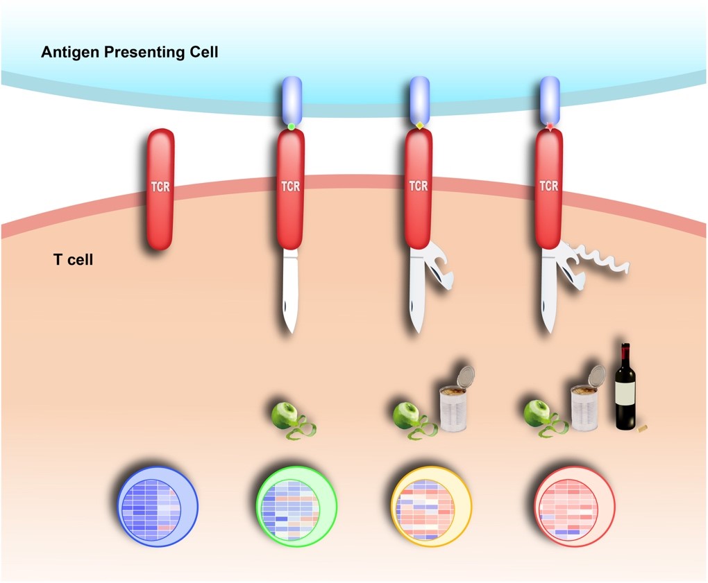 圖2. TCR結(jié)構(gòu)多態(tài)性模型。TCR可以在不同抗原刺激下產(chǎn)生不同的開放性構(gòu)象,從而引發(fā)特異性的下游信號通路,使得T細胞獲得不同的效應功能。這個模型解釋了T細胞獲得抗原特異性的信號基礎。