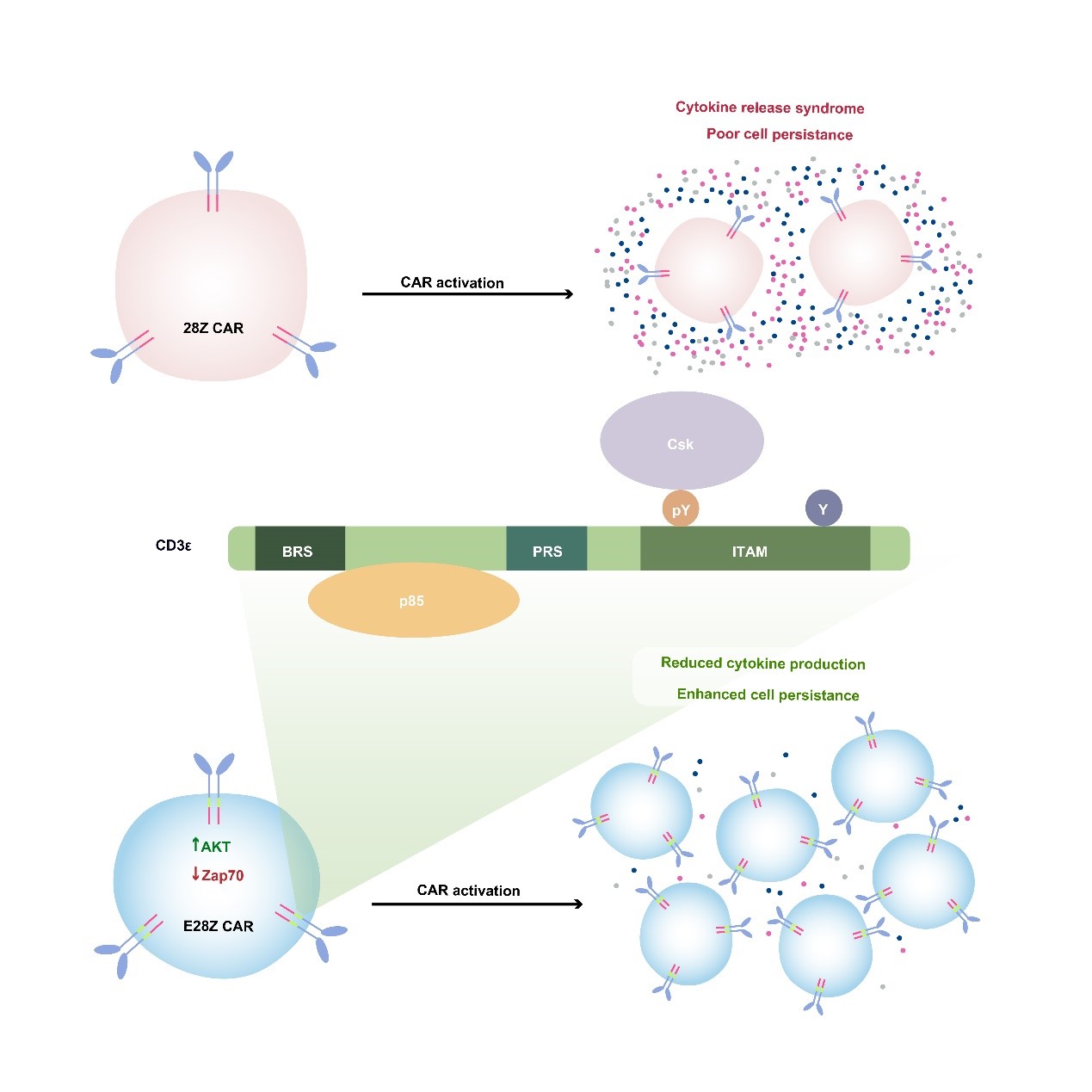 圖4. 基于CD3e 蛋白多重信號功能而設計的新型CAR-T細胞療法。TCR的CD3e 鏈具有特殊的信號轉(zhuǎn)導功能,可以同時招募抑制性分子Csk和活化性分子PI3K。將CD3e 胞內(nèi)區(qū)加入臨床使用的CAR序列中,可使得CAR-T細胞生長持續(xù)性更好,抗腫瘤功能更強,并且細胞因子釋放綜合癥的風險降低。