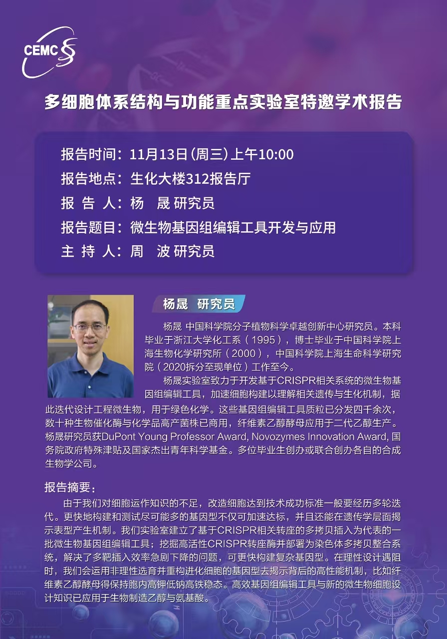 中國科學院分子植物科學卓越創(chuàng)新中心?楊晟 研究員:微生物基因組編輯工具開發(fā)與應用