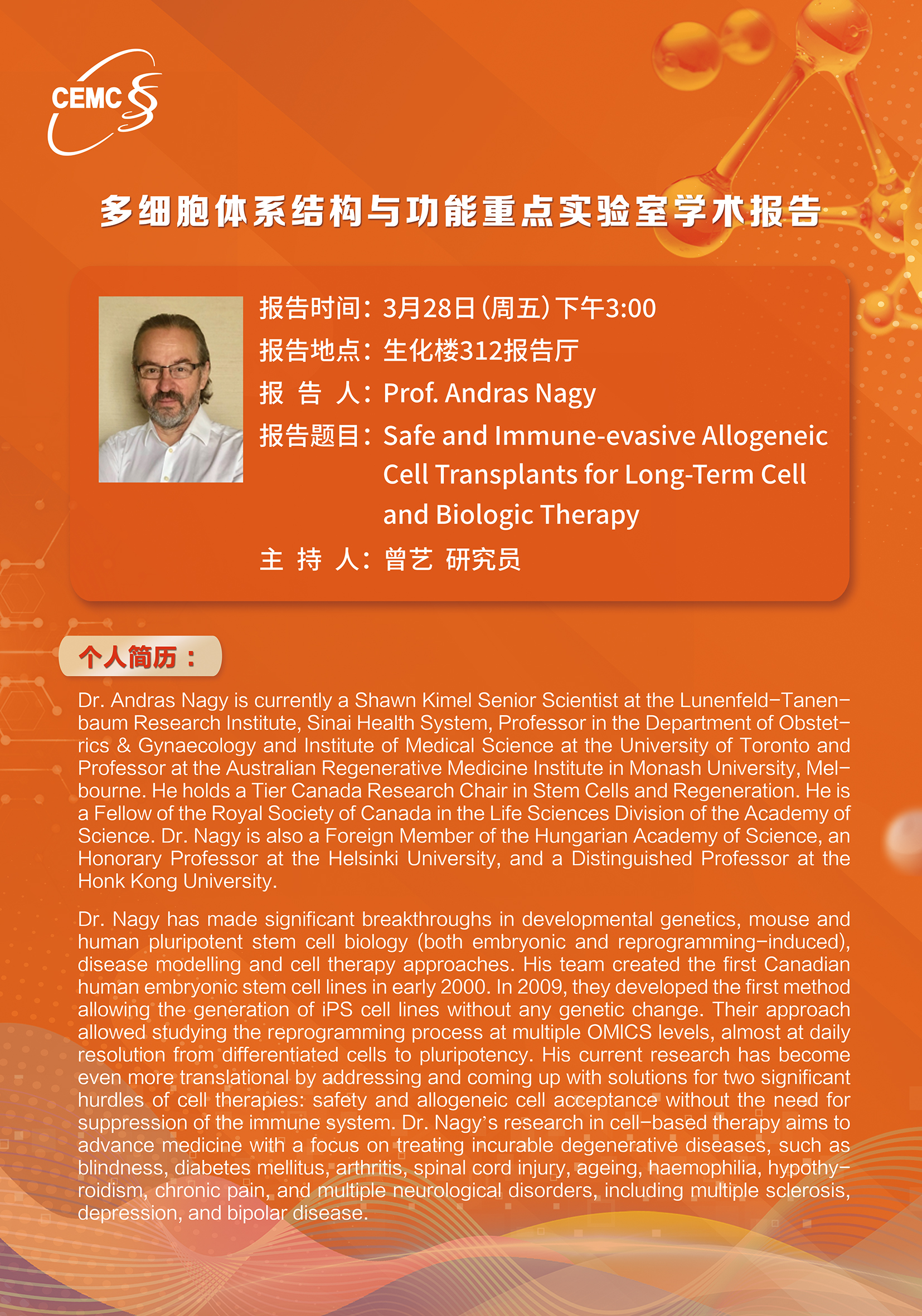 Prof. Andras Nagy, Lunenfeld-Tanenbaum Research Institute:?Safe andlmmune-evasive AllogeneicCell Transplants for Long-Term Celland Biologic Therapy